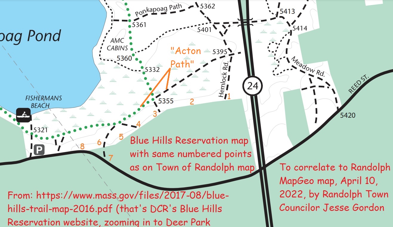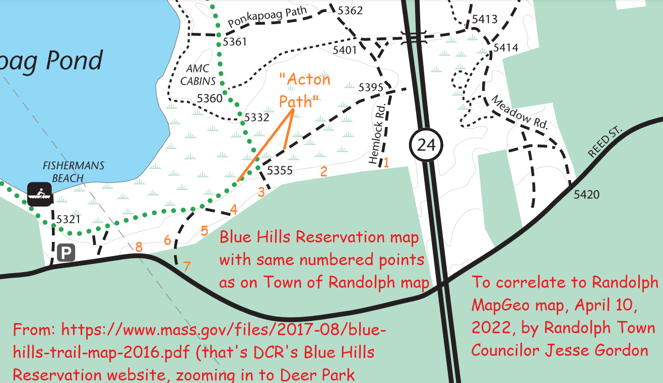 Here's a map of the four "spur trails" that border Deer Park in Randolph. The points marked 1, 2, 3, 6, and 8 are where trails from the state park meet right-of-way entrances in Randolph. Councilor Gordon will work to clarify what connects to where -- it's not so clear!