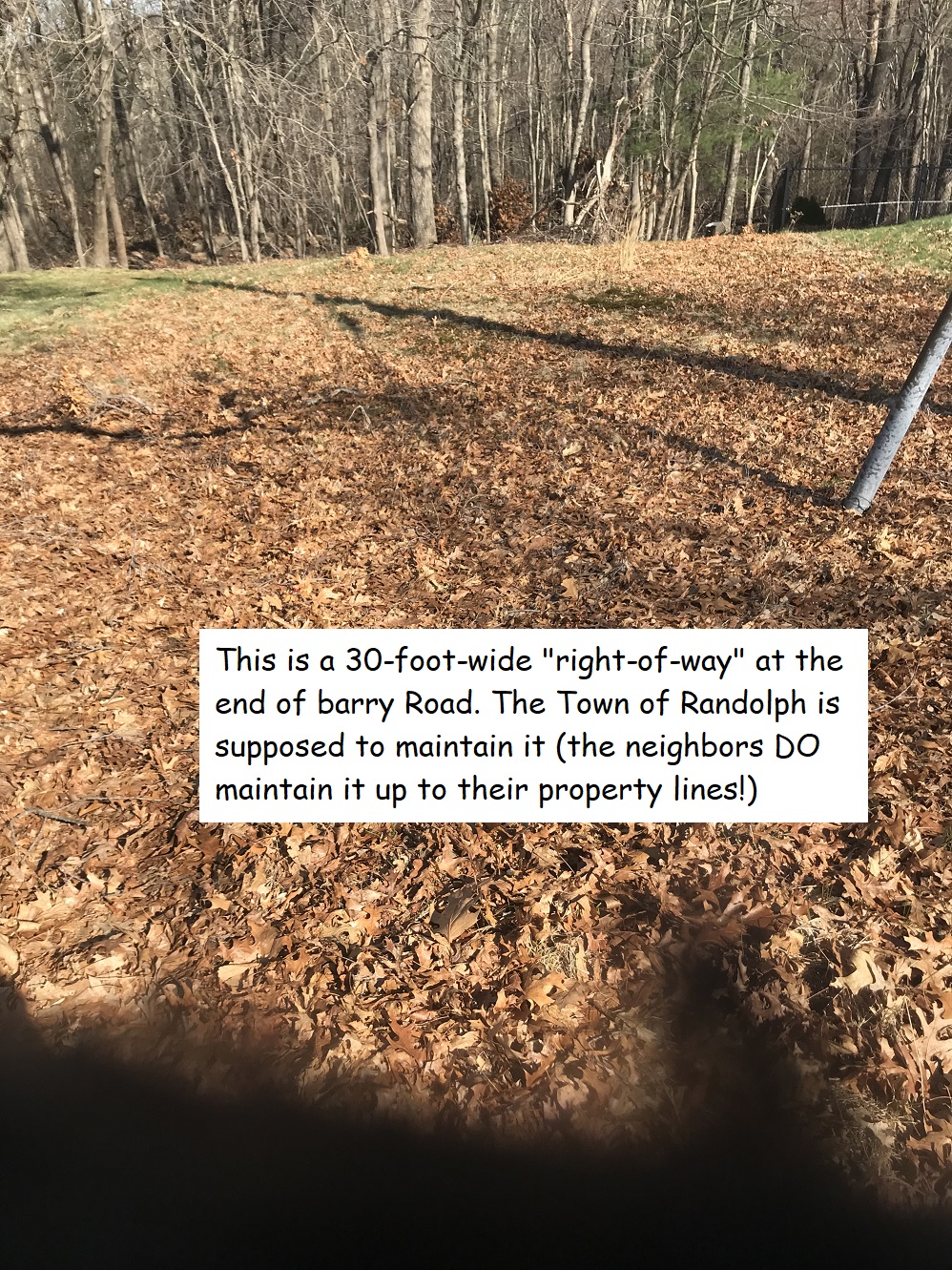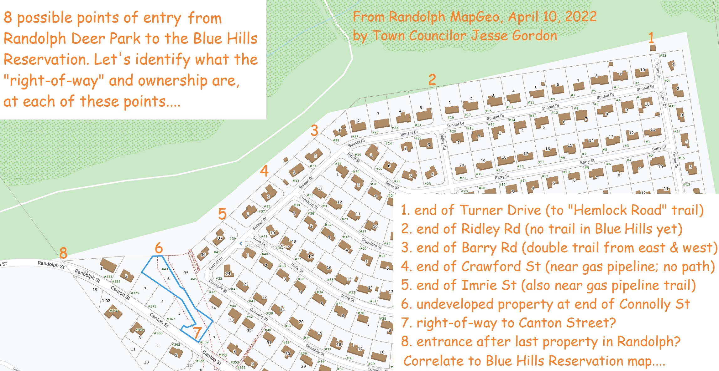 POINT 3: The dead end of Barry Road (across Sunset Drive) is a public right-of-way from Randolph into the Blue Hills Reservation. Councilor Gordon proposes to add "Welcome" signs for pedestrians on the Randolph side, and to clear the trail on the Blue Hills side, to allow hundreds of Randolph residents to walk to enjoy the state park.