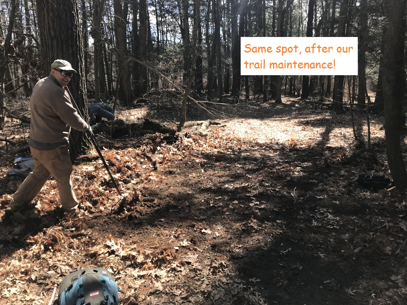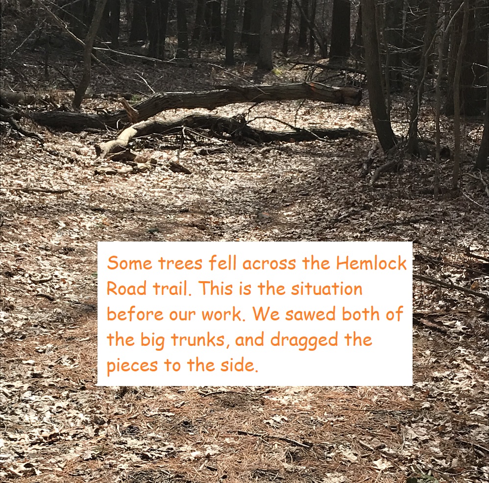 Here is how FBH trail maintenance works -- this one is on "Hemlock Road", just north of Turner Drive in Deer Park. FBH provides tools (and volunteers if needed -- it took three of us to move some heavy trees here!). You look around to see what needs doing -- like fallen trees blocking the trail, or growth from the sides blocking the footpath, or water damage that can be remediated -- and you fix it then file a "work report". The FBH has training sessions to teach you the ropes. Here, a tree fell over the trail, knocking down some smaller trees, and we had to saw through several trunks and then drag the pieces off to the side. It took about 20 minutes.