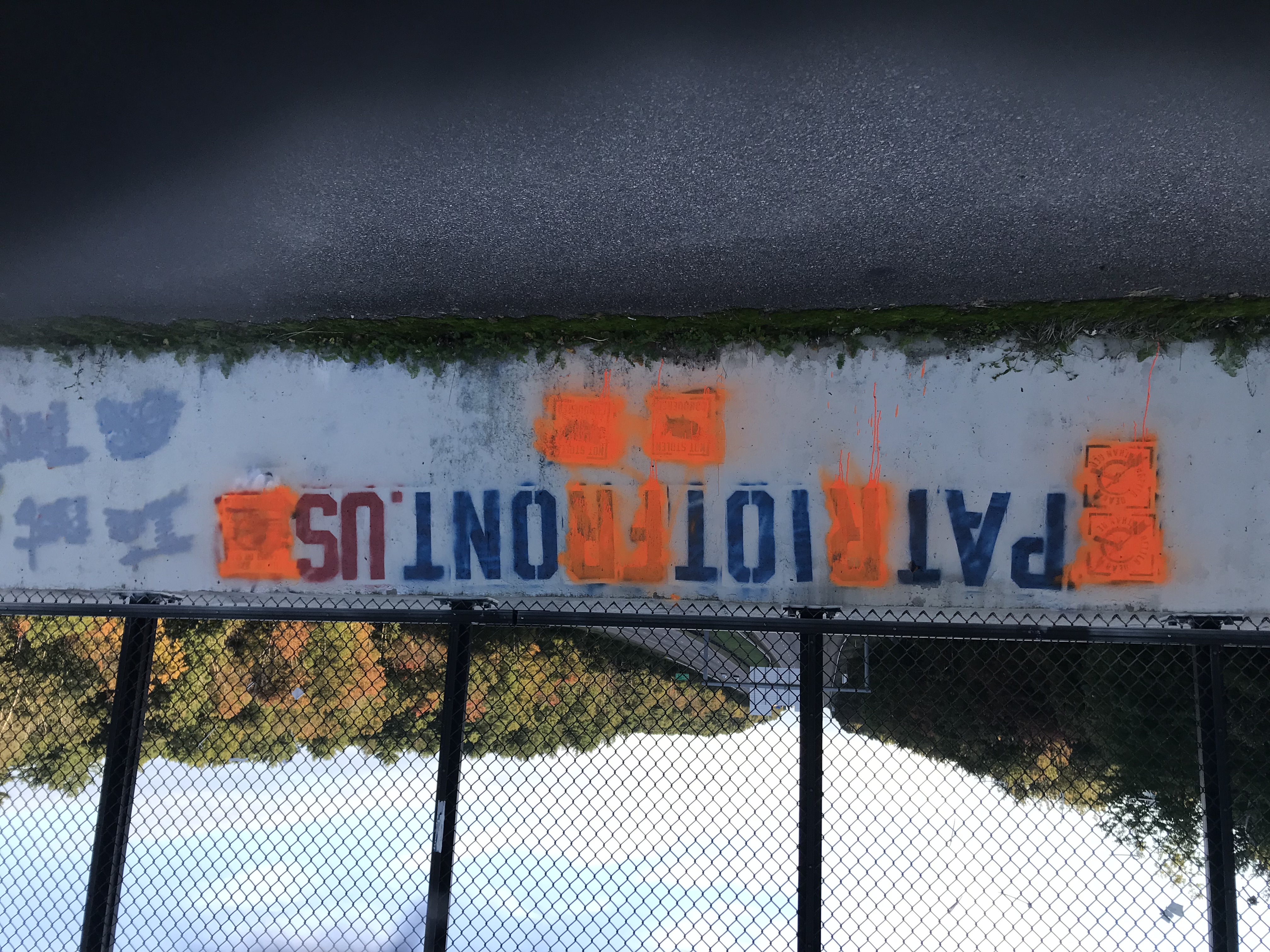 See IMG_6502 -- This is a white supremacist group "stenciling" the Horse Bridge. I reported this to the Randolph DPW to ticket them for defacing public property, and I recommended to the ADL that we prosecute the group for publicly advocating violence. Their website indicates that they have stenciled this same hate message all over Massachusetts -- I will follow up with other Town Councilors in other targeted towns to try to jointly prosecute. I asked DPW if they could paint this over -- maybe DCR can? (I will paint over it myself, if not done quickly).